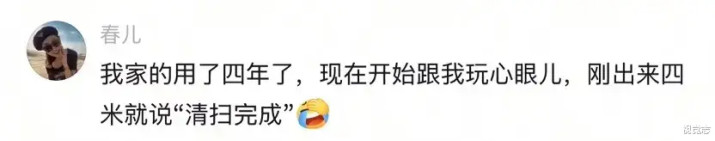 网友分享,用了四年的扫地机器人,开始玩心眼,出来走了四米,就说“清扫完成”, 理直气壮地回基站充电去了。