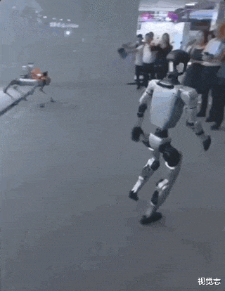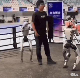 拳击机器人上台,直接照着教练员的后背来了一拳,换来一脚。